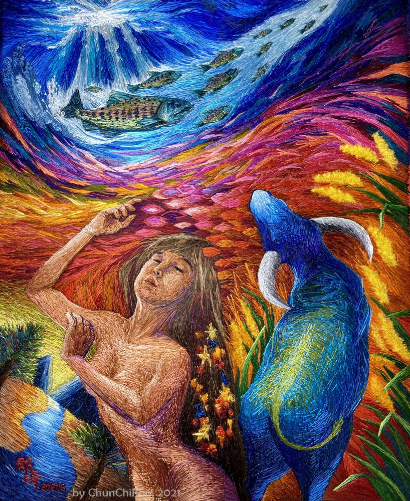 此畫圖稿原本為作者自己的油畫作品,接觸繡畫(亂針繡)之後,發現洋流與夢境的絢麗色彩更適合使用絲線繡畫來表現。