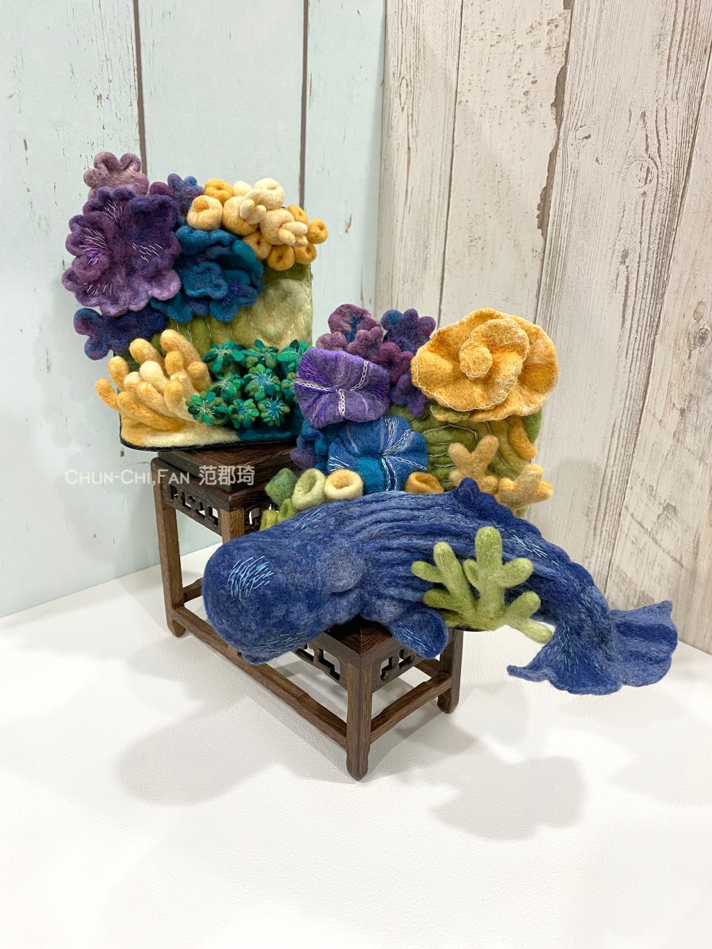 ● 媒材:馬卡龍羊毛 (美麗諾短纖羊毛)、羊毛粒、蠶絲線、DMC 棉線、金蔥線、不織布底布。